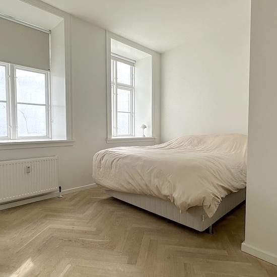 Beliggende på 2. sal, i denne smukke ejendom, udlejes en skøn fireværelses lejlighed på 242 m2. Lejligheden er indrettet med en entre, med indbyggede skabe, hvorfra der er videre adgang til et gæstetoilet samt et stort badeværelse med bl.a. badekar og en kæmpe brusesektion med dobbelt bruser. Videre fra entreen har man lejlighedens tre soveværelser på venstre side. Til højre side kommer man til et stort køkken med alle hårde hvidevarer, herunder bl.a. opvaskemaskine, Quooker, dampovn og vinkøleskab. Der er mulighed for en stor spiseplads i f...