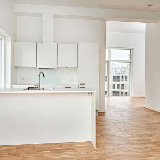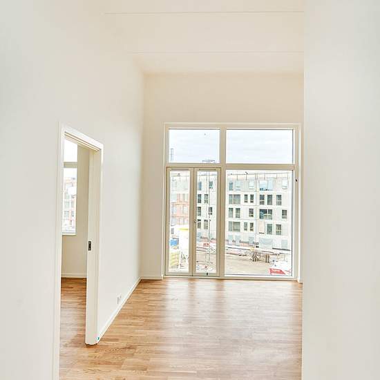 Boligen har et lyst og åbent køkken-alrum, hvor køkkenet er placeret langs væggen og ligger i naturlig forlængelse af spisepladsen. Her er god plads til både hverdag og gæster, og rummet fungerer som boligens naturlige samlingspunkt. Fra alrummet er der adgang til den hyggelige stue, som har plads til sofaarrangement og tv. Stuen har direkte udgang til terrassen, hvilket giver et dejligt lysindfald og en let overgang mellem inde- og udeliv. Lejlighedens soveværelse er velproportioneret med plads til dobbeltseng og indbyggede skabe, som sikre...