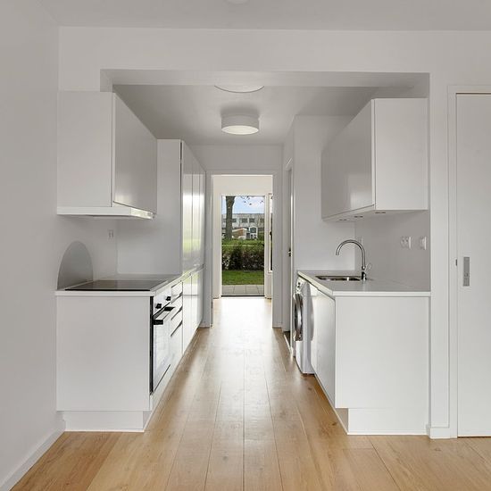Denne moderne 2-værelses lejlighed fra 2020 er beliggende i stueplan og byder på en veludnyttet planløsning samt et skønt lysindfald. Boligen er indrettet med et åbent køkken-alrum i forbindelse med stuen, et lyst badeværelse samt et rummeligt soveværelse med direkte udgang til en dejlig overdækket terrasse, hvor der er god plads til både afslapning og udeliv. Det stilrene, hvide køkken er fuldt udstyret med ovn, kogeplade, emhætte, køle-/fryseskab, opvaskemaskine og vaskemaskine, hvilket giver en praktisk og funktionel hverdag. Badeværelset...