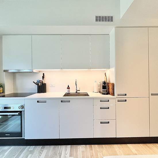 Velkommen til denne nybyggede 1-værelses lejlighed på Østre Havnepark i Aalborg - tæt på Øgaden og centrum. Boligen kommer med et fuldudstyret Svanekøkken med køle/fryseskab, opvaskemaskine, kogeplade, ovn og emhætte. Grundet de store vinduespartier og lejlighedens sydvendte placering er der altid et fint lysindfald. I hele boligen er der installeret gulvvarme og ventilationsanlæg, mens der i badeværelset er installeret en praktisk vaskesøjle. I den opvarmede og aflåste kælder finder du cykelparkering samt lejlighedens tilhørende depotru...