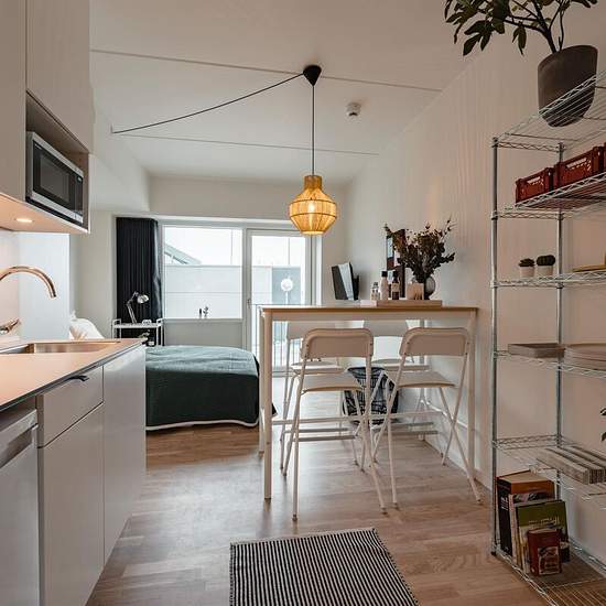 Blækhus Aarhus offers 319 fantastic and fully serviced rental apartments (30-35m2) with their own kitchen, spacious bathroom, living room with built-in wardrobes and a French balcony. A number of benefits that make Blækhus Aarhus a lovely place to live: - 10 common rooms with adjoining balconies. - Rooftop terrace with a pétanque court and views over Aarhus. - Possibility to borrow rooms for larger gatherings. - Common areas in the iconic premises of the neighboring building "Kulturbunkeren", where you can meet your study group. - Possibly t...