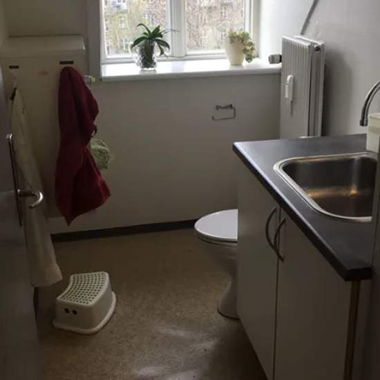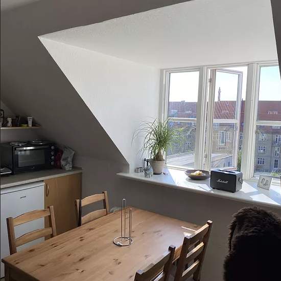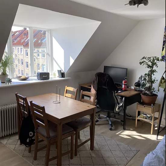 Charming room in Trøjborg This charming room rental is located at the top of the building on the 5th floor and offers its own kitchen facilities with a refrigerator, a combi oven and two hotplates. The room has plenty of space for both a dining table and a bed. Along the corridor there are a total of four rental rooms, which efficiently share common toilets and shower facilities. The property includes a cozy, sheltered courtyard where residents can enjoy a peaceful moment surrounded by greenery. There is a right to use the shared pay laund...