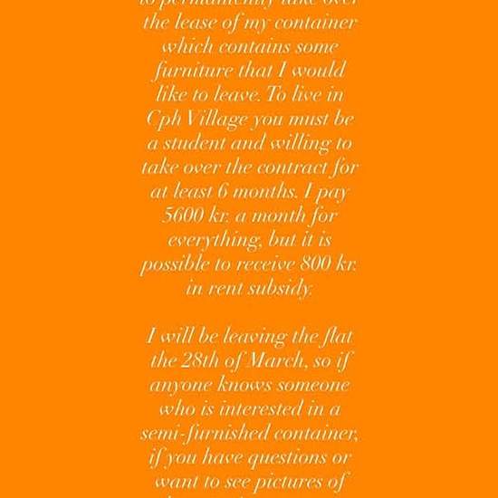 Hey guys Perhaps someone wants to be a part of Cph Village Nørrebro? I am looking for someone to permanently take over the lease of my container which contains some furniture that I would like to leave. To live in Cph Village you must be a student and willing to take over the contract for at least 6 months. I pay 6015 kr. a month for everything, but it is possible to receive 800 kr. in rent subsidy. Move-in is possible from 1 May, so if anyone knows someone who is interested in a semi-furnished container, if you have questions or want to se...