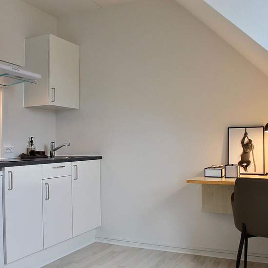 Furnished student studio in the heart of Horsens C The 44 bright studio apartments each include their own kitchen, bathroom and toilet as well as a larger entryway and wardrobe space. Each apartment also includes: • Free internet. • Free electricity. • Bed and armchair. • Several of the apartments also have a desk, table lamp, wardrobe mirror, reading lamp and bedside table. • Private storage room. • The kitchen has induction hob(s), a refrigerator with freezer compartment and an extractor hood. The dormitory’s shared facilities include, a...