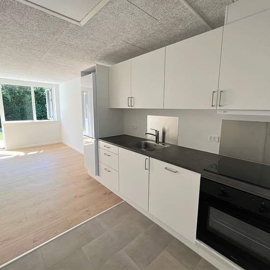 Lovely one-room terraced house located in Kjellerup. From the front door you enter a small vestibule with tiled floor and a closet, where connections for a washing machine and dryer have been prepared. From here there is access to the property's bathroom, which contains a shower, sink and toilet. From the vestibule there is also access to the apartment's open-plan living room/kitchen. The entire apartment was completely renovated in June 2023 with new floors, cabinets, kitchen, tiles, ceilings, etc. The kitchen has a new glass-ceramic hob,...