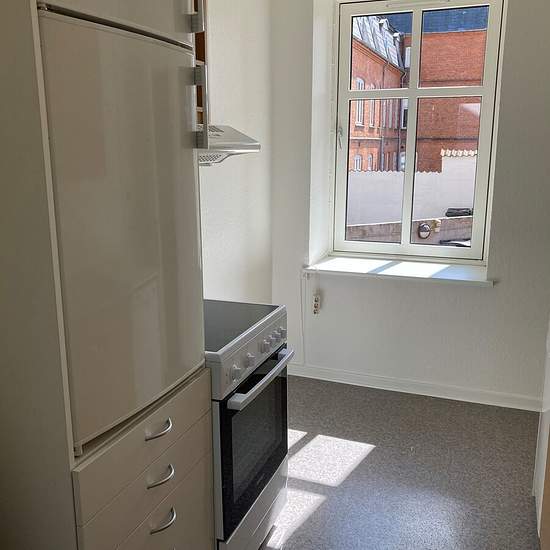 Central location in Viborg city center, close to the pedestrian street, shopping and amenities. Cozy apartment comprising a living room, kitchen with appliances including a dishwasher, bathroom and entrance hall. The living room has wooden flooring. The building also has an intercom. A private storage room in the basement is included. There is access to a shared laundry room and bicycle cellar in the building, and residents have use of a communal courtyard.