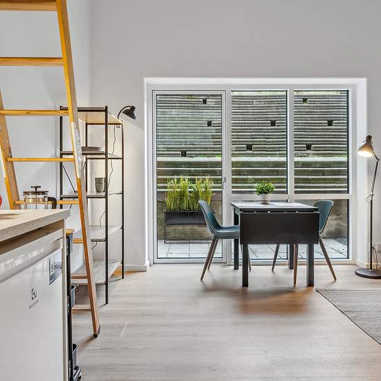 Moderne og flot 1-værelses lejlighed med hems Denne 1-værelses lejlighed ligger i stueetagen, og den er indrettet med eget tekøkken, der er udstyret med en 2-zoners kogeplade og et køleskab med fryseboks samt emhætte. I lejligheden er der højt til loftet, en hyggelig hems og en privat terrasse. Derudover er der eget badeværelse med separat bruseniche og et toilet. Ejendommen har flere fællesarealer både indendørs og udendørs. Indenfor finder man tre større fællesrum, der primært fungerer som fællesvaskeri. Der er dog også placeret enkelte b...
