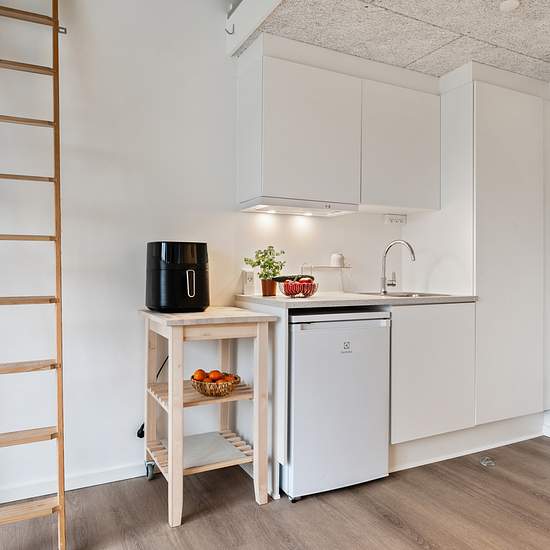 Beautiful apartment with balcony and mezzanine This studio apartment is located on the 1st floor and is fitted with its own kitchenette, which is equipped with a 2-zone hotplate, a refrigerator with a freezer compartment, and an extractor hood. The apartment has high ceilings, a cozy mezzanine, and a large sunny balcony. In addition, there is a private bathroom with a separate shower cubicle and a toilet. The property has several common areas both indoors and outdoors. Inside you will find three larger communal rooms that primarily functio...
