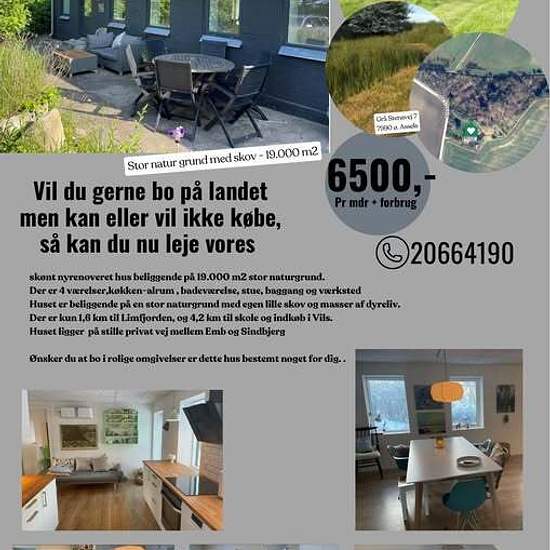 Hej , vores skønne land hus er til leje fra maj måned , (muligvis før ) Det ligger på stille privat vej 4 km fra Vils , mellem sindbjerg og Emb på sydvest Mors så ønsker du at bo på landet men kan eller vil ikke købe, kan i nu leje vores - huslejen er 6.500kr i måneden + forbrug Skriv eller ring til Ditte,