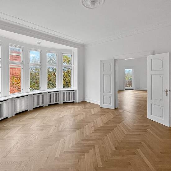 On Grønningen, where the rows of trees run along Kastellet and the city opens up towards Østerport, you will find this stately apartment in one of the boulevard’s most prominent buildings. The apartment has just been comprehensively renovated from top to bottom and has not been lived in since the refurbishment. The reception rooms are arranged in a classic enfilade with high ceilings, beautiful stucco details and continuous herringbone parquet. The large window sections facing Grønningen provide generous light in the rooms, and the rounded b...