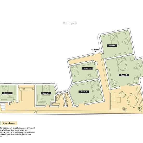 Description - space This beautifully located apartment has six room, two couples rooms and three single rooms, with each room being relatively big and spacious. The combined dining room and living room has a beautiful view out towards the lake, making it the perfect place to hang out and relax. There are two bathrooms with showers, where one is really big and the other is smaller. At the end of the apartment is the big kitchen, with a modern design. The unique part of this apartment is the location and view. The road in front of the apartmen...