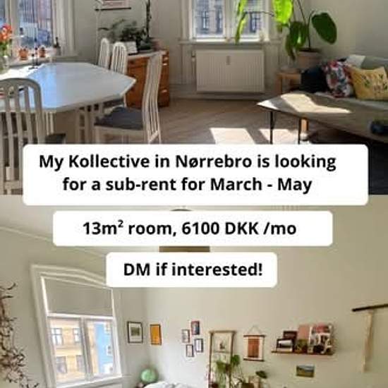 ## ** **Subrent Room in Cozy Nørrebro Collective – By the Lakes Hi! I’m Marina, and I’m subrenting my lovely 13m² room in Nørrebro, just by the lakes and very close to the city center. You can bike anywhere in 20 minutes Super well connected by bus, train, and metro Walking distance to the lakes **The Apartment ** You’ll be sharing a spacious and warm apartment with: 6 individual rooms A cozy living room 2 bathrooms Fully equipped kitchen **The Room ** 13 m² 6100 DKK/month Temporary sublet (no CPR registration possible) Sub-rent...