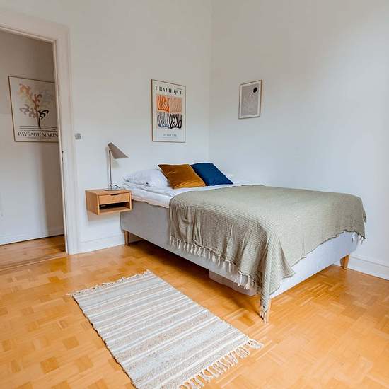 High-quality bed with bedspread, duvet and pillows. Bedside table with reading lamp. Desk with chair and desk lamp. Wardrobe with drawers and hanging space. Storage boxes underneath the bed. Curtains, mirror, laundry basket, trash can, rugs and decorations (not all shown in photos). 1) Cancellation made 60 or more days before the check-in date: for the tenant, reimbursement of 100% of the first instalment minus Roomless fees. 2) Cancellation made between 30 and 59 days before the check-in date: for the tenant, refund of 50% of the first ins...