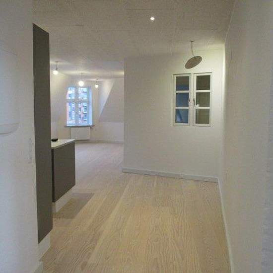 Modern 2nd-floor apartment, 114 m². You live in the heart of Aabenraa. Older well-maintained property with a closed courtyard. Built in 1906. The apartment has been rebuilt and modernized throughout. Layout: entrance, large room, bright bathroom with shower cubicle and built-in cupboards, wall-hung toilet, towel radiator and space for a washing machine. Large bedroom with access to a balcony. Modern kitchen open to the living room. The kitchen has new cabinets, new appliances and a Quooker with boiling water. The living room has several s...