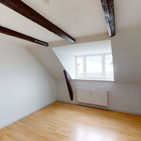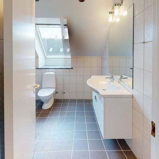 When you step into the apartment's large entrance hall, you're greeted by beautiful ceiling beams, built-in cupboards and plenty of space. A modern, bright kitchen with lots of cabinet space and a dishwasher. There is also ample room for a dining area in the kitchen. The modernized bathroom includes a shower enclosure, storage under the sink and lighting in the mirror. The living room is spacious with lovely natural light and plenty of room for a seating area and a dining table.