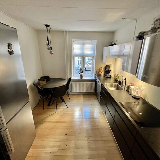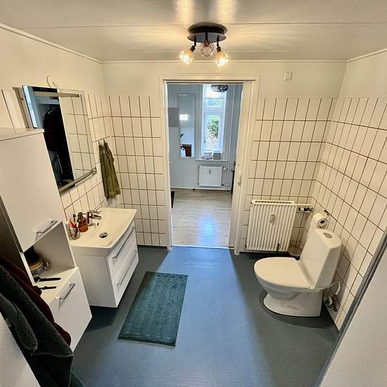 Denne super dejlige lejlighed er meget rummelig og lys. Når man træder ind i lejligheden kommer man ind i entreen, hvor man kan sætte sit overtøj og sko, inden man kommer ind i lejligheden. Fra entreen har vi også den ene indgang til badeværelset. Ejendommen er handicap/ældrevenlig, og har derfor to indgange. Man kan selvfølgelig altid vælge, at lukke det ene af, og eventuelt stille en kommode m.m. foran. Når man træder ligeud fra entreen kommer vi ind i den store stue, hvor man kan se, at der er masser af gulvplads og nogle gode vinduer. De...