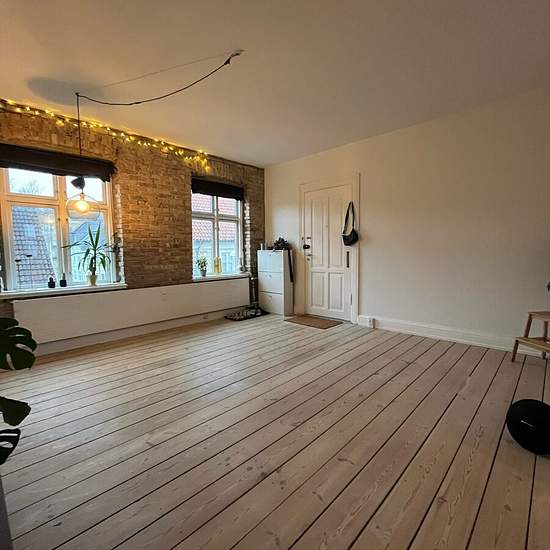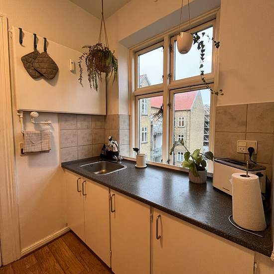 Here you have a really nice apartment with one of Aalborg’s loveliest courtyards. The apartment consists of a large living room with room for a proper sofa and a dining area plus a little extra. There is also a bedroom with space for both a wardrobe and a double bed. From both the bedroom and the kitchen there is a view of the courtyard, which is lovely compared with other properties that look out onto a dull backyard or into the neighbouring building. The kitchen is a classic 1970s brown kitchen, suited to those who like a retro style. You...