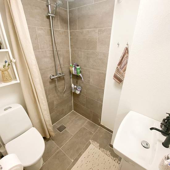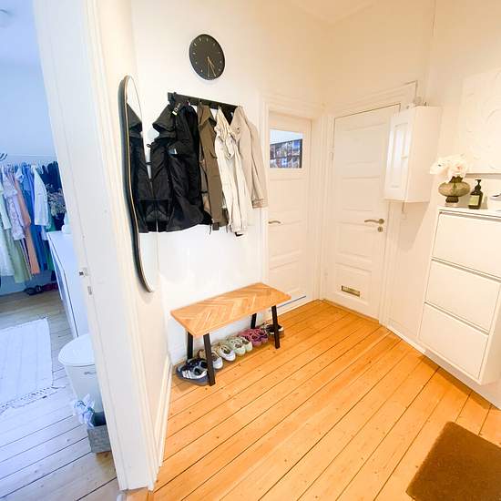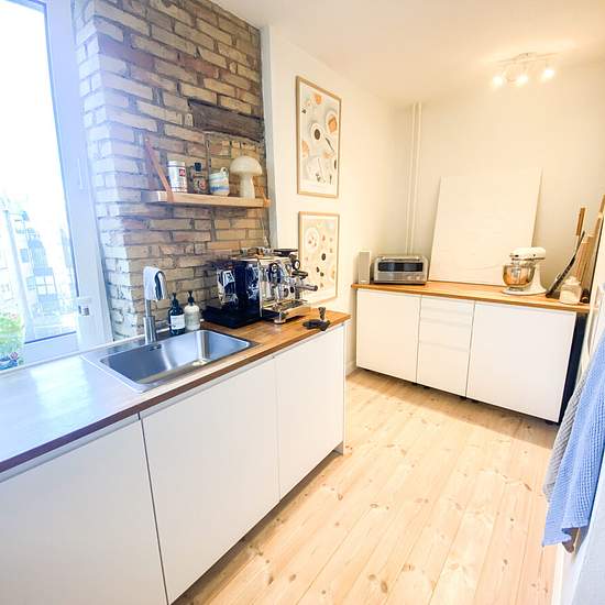 Welcome to this lovely apartment located in the heart of the city. At the entrance you are met by a spacious hall, where you can immediately picture your own interior. The kitchen features modern white units and a beautiful wooden countertop that adds warmth to the room. New York-style walls add character, and there is plenty of space for extra counter space at one end of the kitchen. Here you will find both a dishwasher and a washing machine, which make everyday life easier. The bathroom, which is accessed via the kitchen, has been elegan...