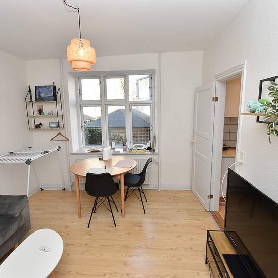 Welcome to this apartment where light and coziness meet a central location in Aalborg. A move-in ready home with a pleasant atmosphere. The apartment offers a functional layout with a hallway that provides access to a lovely living room and a bedroom. The living room, which faces a sunny courtyard, is an ideal place to relax, while the neat kitchen with white cabinet units, stove, fridge-freezer and extractor hood invites cooking and socializing. The bathroom is spacious and elegantly fitted with white tiles and a large shower area, giving ...