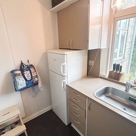 Når man træder ind i lejligheden, kommer man ind i en entré med en knagerække og plads til lige at ankomme og sætte sko osv. Den er også en fordelingsgang, der fører ind i lejlighedens forskellige rum. Der er et lille fint køkken i 70’er stil i en pæn lysebrun farve, der ikke er for meget. Her er der installeret et køleskab med fryser også. Den brune farve fortsætter ude på badeværelset, hvor der er indsat brus, men stadig en god plads. Inde i stuen er der rigtig god plads til en stor sofa og et spisebord i en god størrelse også. Trods de...