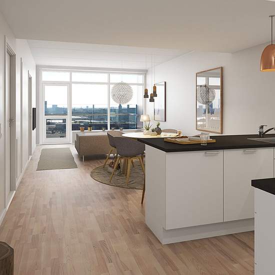 Moderne og indbydende boliger ved vandet – Havneholmen, Aarhus Ø På Havneholmen bor du moderne, lyst og komfortabelt – lige ud til vandet i hjertet af Aarhus Ø. Her finder du lejligheder med 2, 3, 4 eller 5 værelser, alle med enten terrasse i stueplan eller altan fra første sal og op. Alle opgange har elevator direkte fra p-kælderen og op til lejlighederne – praktisk og bekvemt i hverdagen. Boligerne er indrettet med åbent opholdsrum, hvor køkken, spiseplads og stue er integreret i ét lyst og luftigt rum. De store vinduer skaber et skønt ...