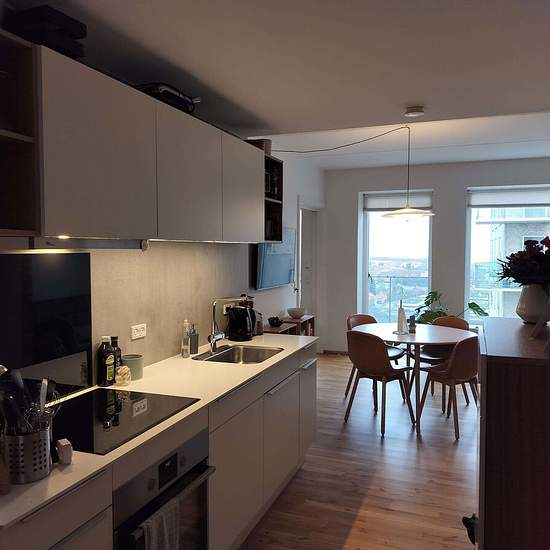 About Nabolaget In Aarhus North you'll find Nabolaget, which consists of 390 quality apartments built with a focus on creating a pleasant setting for your everyday life. Here you'll find oak floors, walls of raw concrete and charming reclaimed brick in some of the apartments. You'll get beautiful natural stone in the bathrooms, and the kitchens are white HTH kitchens. There is a dishwasher, washing machine and tumble dryer in all apartments. In addition, there is underfloor heating in all the apartments. Educational institutions nearby N...