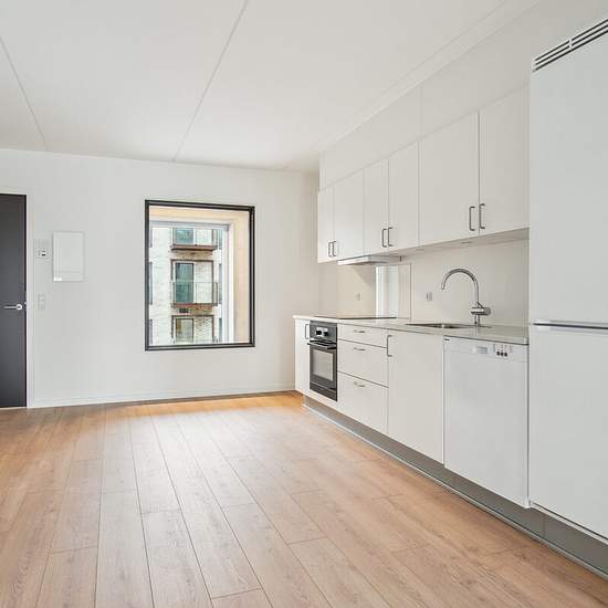 Attractive rental apartment with a balcony facing a lovely courtyard. The apartment is state-of-the-art with light finishes and includes a dishwasher, a washer-dryer stack, and a built-in oven. There is an elevator in the building and an associated storage room for the apartment. In the basement there is bicycle parking and the option to rent a parking space (with or without electricity). The property is located in the centre of Aarhus with the light rail opposite, within walking distance of the university, BSS, the IT City, and shopping. Fo...