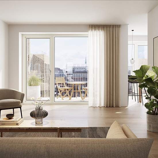 The Residence This 2-room apartment in the Gasværkskarréen combines modern comfort with historic architecture. The apartment is designed with a focus on light and spaciousness, where large windows and rounded corners create a unique atmosphere. The kitchen is fitted with sleek, handleless elements of high quality and modern appliances. The bathroom is elegant and functional with light tiles, a wall-mounted toilet and fittings in a timeless design. The apartment is perfect for singles, couples and students who want a quality home in an attrac...