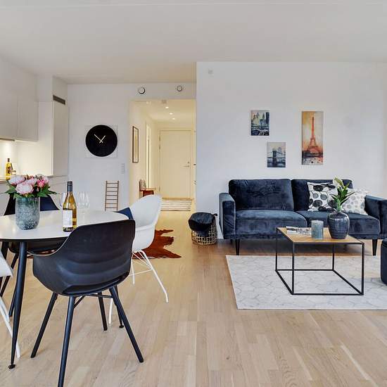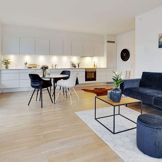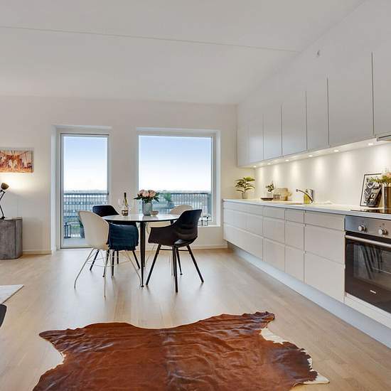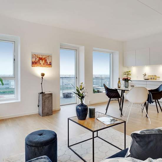 Lovely apartment with balcony near Vestamager Metro Station In southern Ørestad you'll find this lovely apartment in a building from 2016. Inside you'll find a well-thought-out layout, beautiful surroundings and wonderful natural light, while the icing on the cake is the large, sunny balcony. The heart of the home is undoubtedly the inviting living area, where the kitchen and lounge are fully integrated. The single-sided kitchen appears modern and timeless with white handleless fronts, while the spotlights under the wall units help provide...