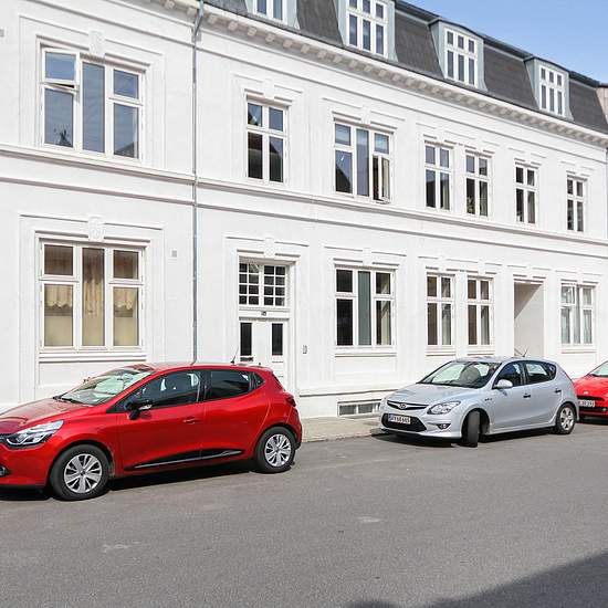 Large corner property from 1897 with 13 units of varying sizes. The property is centrally located on a quiet street; there are shopping opportunities and specialty shops nearby. It is a 3-minute walk to Kongensgade and the library, and a short bike ride to the swimming stadium and Blue Water Arena. There are also several green recreational areas nearby. Street parking is good throughout the day, and there is an intercom with a coded keypad for the tenants' security. There are cellar storage rooms and a communal laundry cellar, and there ...