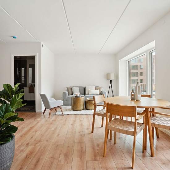 At Murervangen you have the option to choose a floor plan that suits your needs. Depending on the size of the apartment, you get an open-plan kitchen/living area with space to arrange a living room and dining area. The bathroom includes a combined washer and tumble dryer as well as a separate shower enclosure. The apartments have one or more rooms, depending on size. There is a storage room in every rental unit. All homes have either a balcony or a terrace, and some apartments have two balconies or two terraces, giving you plenty of opportu...