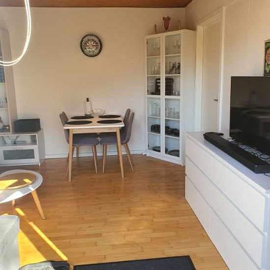 The apartment is in good condition and is part of a small townhouse-style development from 1995. It comprises a large bathroom, a living room, a bedroom, and a kitchen. The apartment has its own terrace and a parking space, and there is also access to a communal garden and laundry facilities.