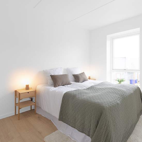 Bright and spacious two-room apartment with a large open-plan kitchen and living room, a large bedroom and its own balcony. The apartment includes its own shed.