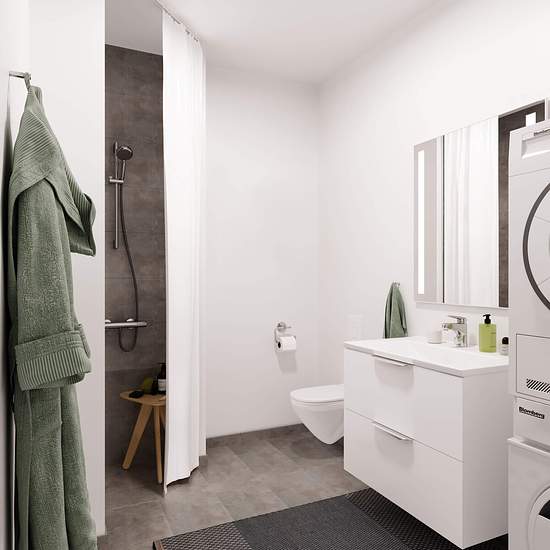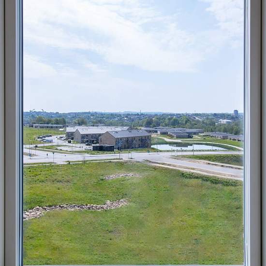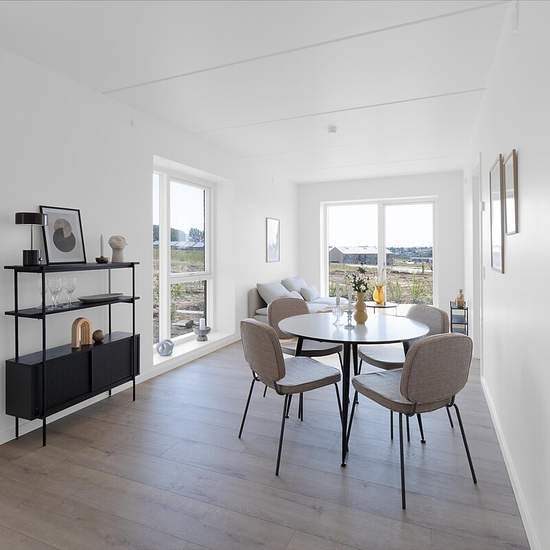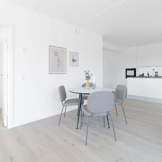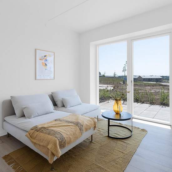 Større toværelses lejlighed med stort og lyst køkken-alrum, stort soveværelse, badeværelse, entré samt egen altan/terrasse. Til boligen hører eget skur.