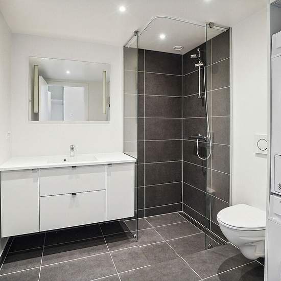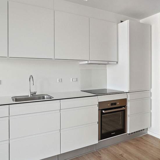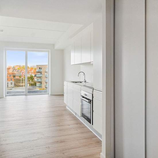 Lejlighederne varierer i størrelse fra 1 til 5-værelser. Du træder ind i entréen, hvorfra der er adgang til boligens køkken-alrum i direkte forbindelse med stuen. Fra køkken-alrummet har størstedelen af lejlighederne udgang til en altan eller terrasse, og de sydvendte gavllejligheder har endda store udeområder med udsigt over vandet. Der er anvendt store vinduespartier på tværs af ejendommen, som skaber optimalt lysindfald i lejlighederne og byder den unikke udsigt ind i boligerne. Fra køkken-alrummet er der adgang til boligens separate være...