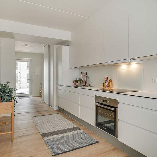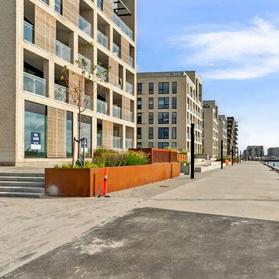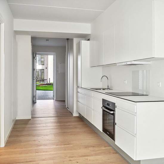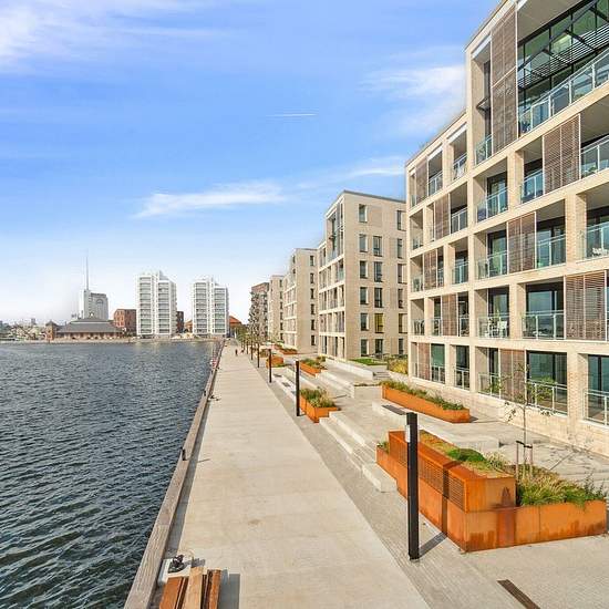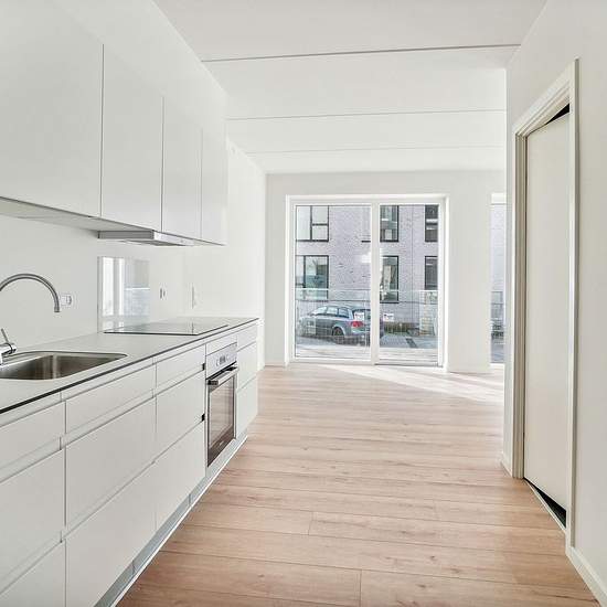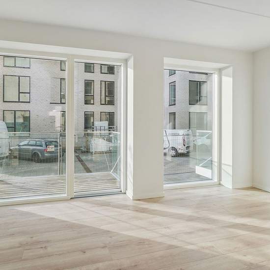 The apartments vary in size from 1 to 5 rooms. You step into the entrance hall, which provides access to the apartment’s open-plan kitchen and living area directly connected to the living room. From the kitchen-living area most of the apartments have access to a balcony or terrace, and the south-facing end apartments even have large outdoor areas with views over the water. Large window sections span the building, creating optimal natural light in the apartments and bringing the unique views into the homes. From the kitchen-living area there ...