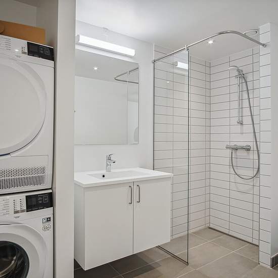 Beautiful, bright and spacious 2-room apartment Spacious, modern apartment with a large, bright open-plan kitchen/living area. The apartment has one bedroom with built-in wardrobes and an entrance hall with extra storage space. The kitchen is equipped with a fridge/freezer, dishwasher, built-in oven, hob and extractor hood. The bathroom is bright and has a shower niche and a stacked washer/dryer. Note: the pictures are from a similar apartment in the building. The buildings are surrounded by large, green communal areas with pleasant paths ...
