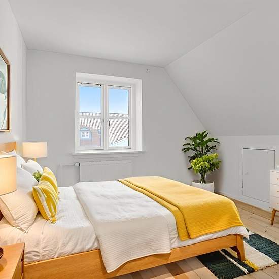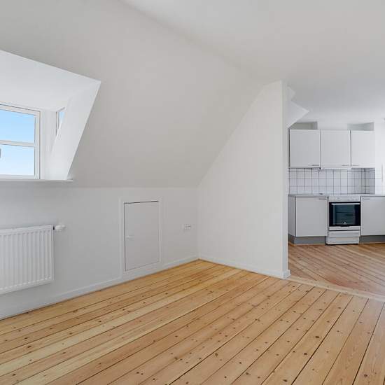 Welcome to an inviting two-room apartment of 48 m2, located on the top floor of a classic, well-kept building with a red tiled roof and plastered façades. Here you get a bright and pleasant home with cozy sloped walls, beautiful plank floors and a calm atmosphere — ideal for a single person or a couple looking for a manageable base with green surroundings right outside. The apartment offers an entry hall with access to all rooms. The living area consists of a living room open to a well-appointed white kitchen. The kitchen has good counter a...