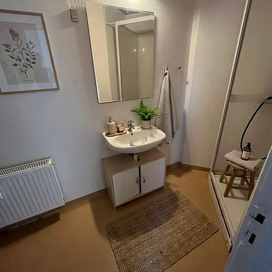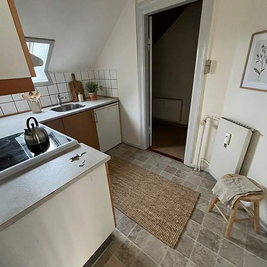 The apartment comprises two separate rooms, making it suitable for both a living room and a bedroom or as a shared flat with each person having their own room. The continuous light floors and white walls make it easy to furnish personally, and the rooms appear bright and inviting. Kitchen The kitchen is a separate room with a practical layout, a tiled backsplash and good counter space relative to its size. It includes a stove with oven, an extractor hood, a refrigerator and a skylight that provides natural daylight at the work surface. Ba...