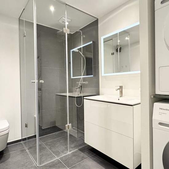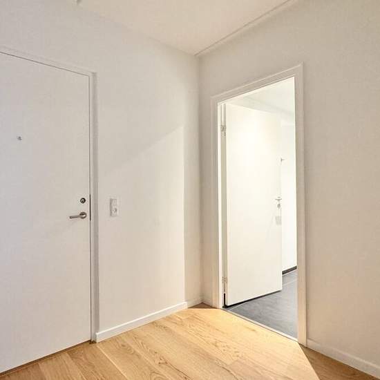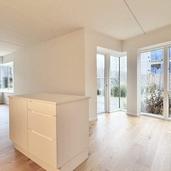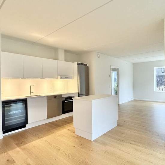 2-room – Munkebjergvænget 90, ground floor, apt. 2 – Odense M This lovely and bright 2-room apartment of 75 m² is located on the ground floor in the fantastic Munkebjerg Park! The building has elevator access. There is a stylish tiled bathroom with a shower niche, wall-hung toilet, etc., from Grohe. Nice mirror with light and a sink with cabinets from Duravit. There is underfloor heating and a lovely Sonos speaker in the corner of the bathroom. A washing machine and dryer from Miele are installed in the bathroom. There is a beautiful open ki...