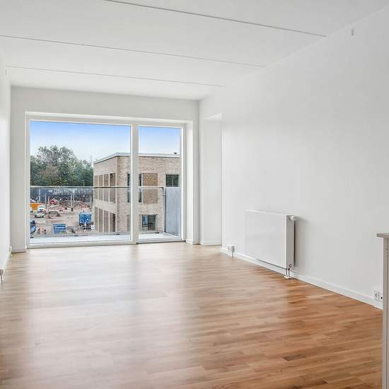 Her får du et moderne hjem med en gennemtænkt planløsning, der skaber ro og sammenhæng i hverdagen. Entré Lejligheden byder velkommen i en rummelig entré med plads til overtøj og opbevaring. Herfra er der et naturligt flow videre ind i boligen, og planløsningen giver et fint overblik fra første skridt indenfor. Køkken/alrum Boligens samlingspunkt er det åbne køkken-alrum, hvor køkken, spiseplads og stue smelter sammen i ét lyst og indbydende rum. Det stilrene køkken er funktionelt indrettet med god bord- og skabsplads, og der er rig muli...