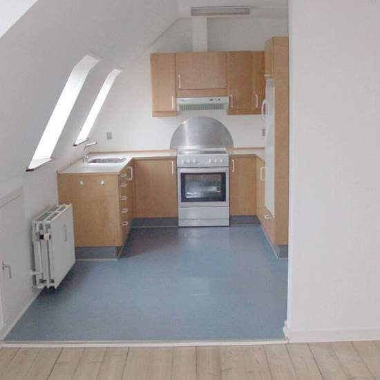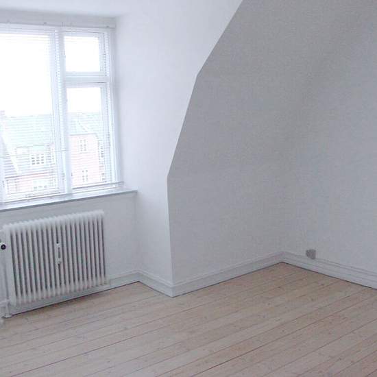 Cozy 2-room top-floor apartment in Randers measuring 73 square meters. This pleasant top-floor apartment welcomes you into a small, cozy entrance hall with practical vinyl flooring, an intercom and a tall cabinet for outerwear. First comes a large, spacious bathroom with practical vinyl flooring, tiled walls and a large, roomy shower cubicle. Further in is a living room that is open to the apartment’s cozy kitchen. The kitchen is older but functional, has plenty of upper and lower cabinets, vinyl flooring and two windows, offering a wonde...