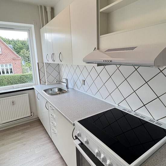Roligt beliggende renoveret ejendom, tæt på park med å-løb og lystbådehavn og i gåafstand fra byens centrum, med et stort udvalg af indkøbsmuligheder. Der er stort fælles gårdhavemiljø til ejendommen. Børneinstitutioner og skoler i gåafstand. Vaskefaciliteter henvises. Afhøvlede massive trægulve.
