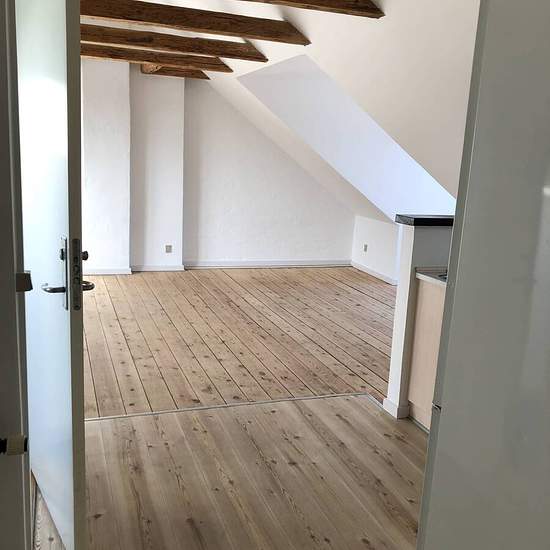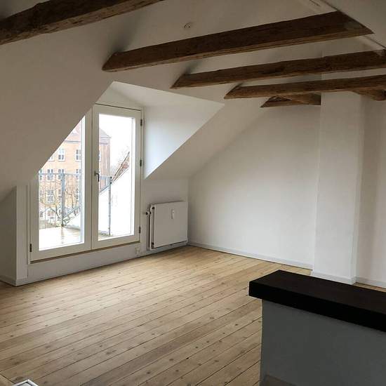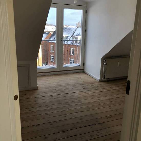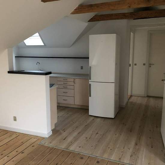 3-værelses lejlighed på 91m2  med flot udsigt fra den lækre altan, udlejes. Lejligheden er malet i lyse indbydende farver, der er synlige bjælker som virkelig sætter et hyggeligt præg over lejligheden. Store vinduer i begge sider af stuen gør, at skråvæggene får et tvist af designer lejlighed. Lyse trægulve er også med til at gøre lejligheden frisk og indbydende. I køkkenet er der installeret komfur, emhætte samt køle/fryseskab. Lejligheden har 2 værelser, samt en stor, lys og dejlig stue. Fra stuen er der udgang til en skøn altan. Lejligh...