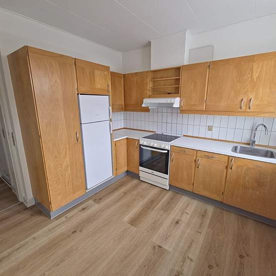 Cozy 2-room apartment with parking in the city center The apartment is bright with soap-treated plank floors in the living room and bedroom. Bright kitchen with beech kitchen units and a dining area. The bathroom has white tiles on the walls and gray tiles on the floor, as well as a glass partition to the shower area. Note: Includes a new ceramic stove. The property, which was built in 1920 and has been continuously modernized, is located in Vejle Vestby near the town center. The property is part of a residential block consisting of 143 ap...
