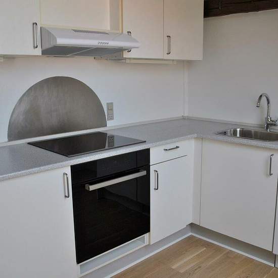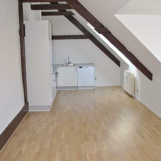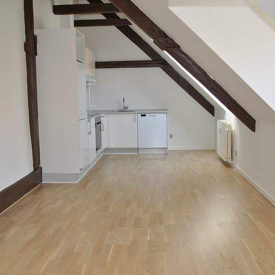 Charming two-room top-floor apartment of 45 m² with exposed beams and wooden floors. The apartment consists of an open living room and kitchen in one, equipped with modern amenities such as a fridge/freezer, oven, hob, extractor hood and dishwasher. The bedroom has built-in wardrobes that provide optimal storage space. The bathroom is fitted with a spacious shower enclosure and a convenient washing machine. Water and heating are paid on account, while electricity is billed directly by the supplier. Floor plan is indicative.