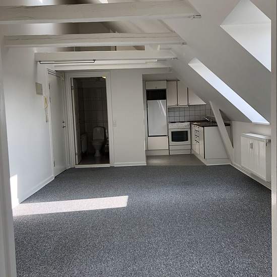 The apartment includes an entrance hall, bathroom, kitchen/living area and a loft at each end of the apartment. One of the lofts can be used as a bedroom, as there is room for a bed. New click-lock flooring will be installed. The apartment has access to a shared laundry and its own basement storage room. Free parking - first come, first served. The property is located in the charming Skibhus neighborhood - close to a gym, grocery stores, the harbour, shops, and within walking/cycling distance of the pedestrian street. At the rear of th...