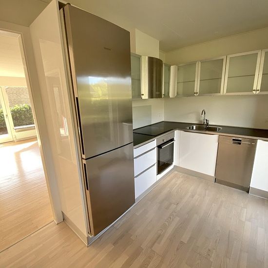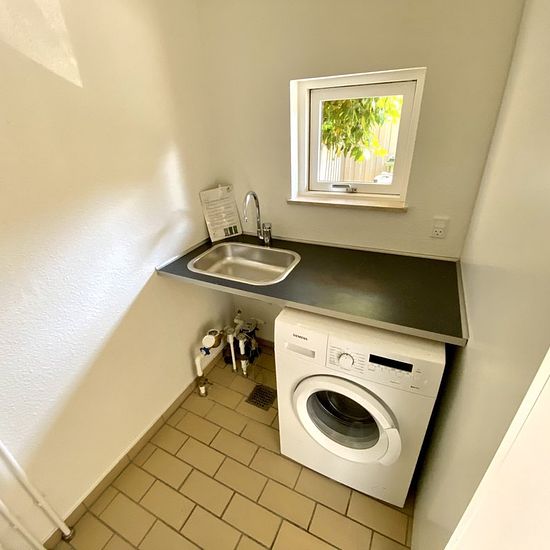 Located centrally in Kværndrup, a beautifully renovated 2-room townhouse of 62 m2 is for rent. The townhouse includes a good entrance area with utility room featuring a washing machine and cabinets. Lovely large tiled bathroom with a shower niche, among other things. There is a spacious bedroom with built-in wardrobes. Beautiful new high-gloss kitchen with all major appliances, including a dishwasher. All appliances are of the Siemens brand. Large bright living room with access to a lovely terrace/garden. There are beautiful lacquered parque...