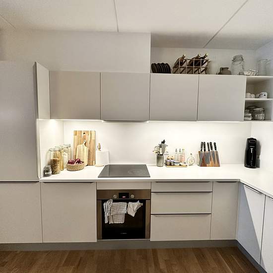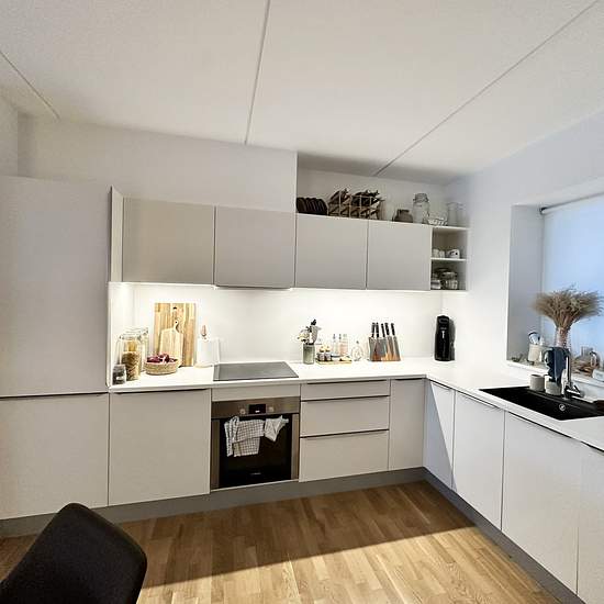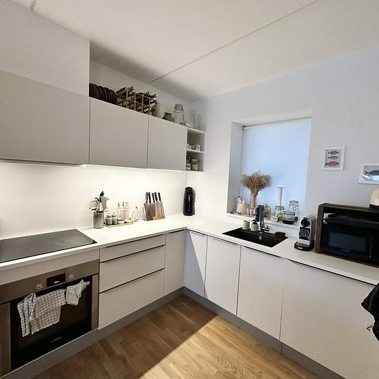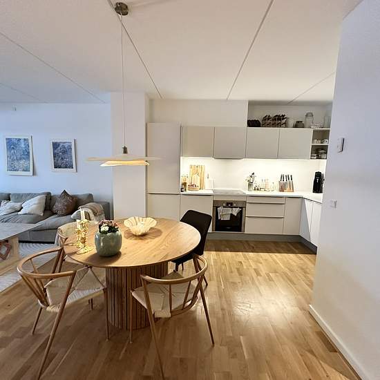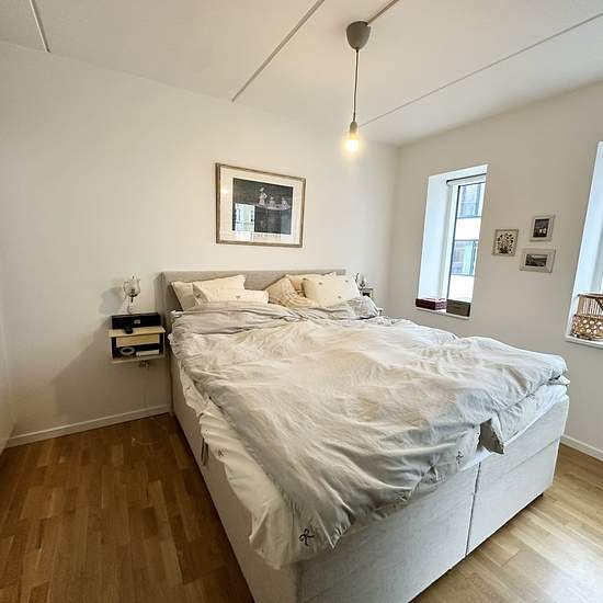 Welcome to this apartment where light and quality meet the attractive location on the Godsbane area. A move-in ready residence with a pleasant atmosphere. The apartment offers an exciting layout with a spacious living room and a lovely open-plan kitchen. Attention has been paid to the details here, with beautiful oak parquet floors that extend throughout the home. The bedroom and an additional nice room both have built-in wardrobes, providing good storage space. The large bathroom features elegant tiles in a travertine look and a practical ...