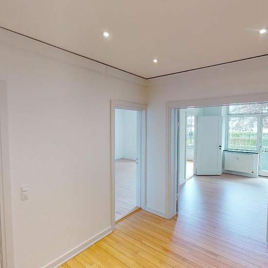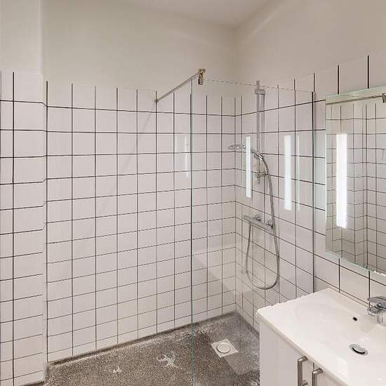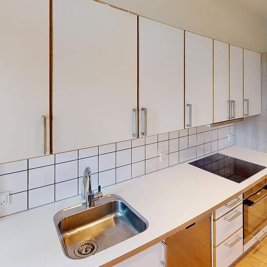 When you step into the apartment you enter directly into a large entrance hall that provides access to the apartment's kitchen, bathroom and three rooms. The kitchen is from AUBO and appears neat and modern with white cabinet doors, all major appliances and white tiles on the wall. The bathroom is large with white tiles on the wall, a separate shower area separated by a glass wall, storage under the sink and lighting in the mirror. There is access to nice balconies from two of the apartment's rooms. The apartment is staged with AI images an...